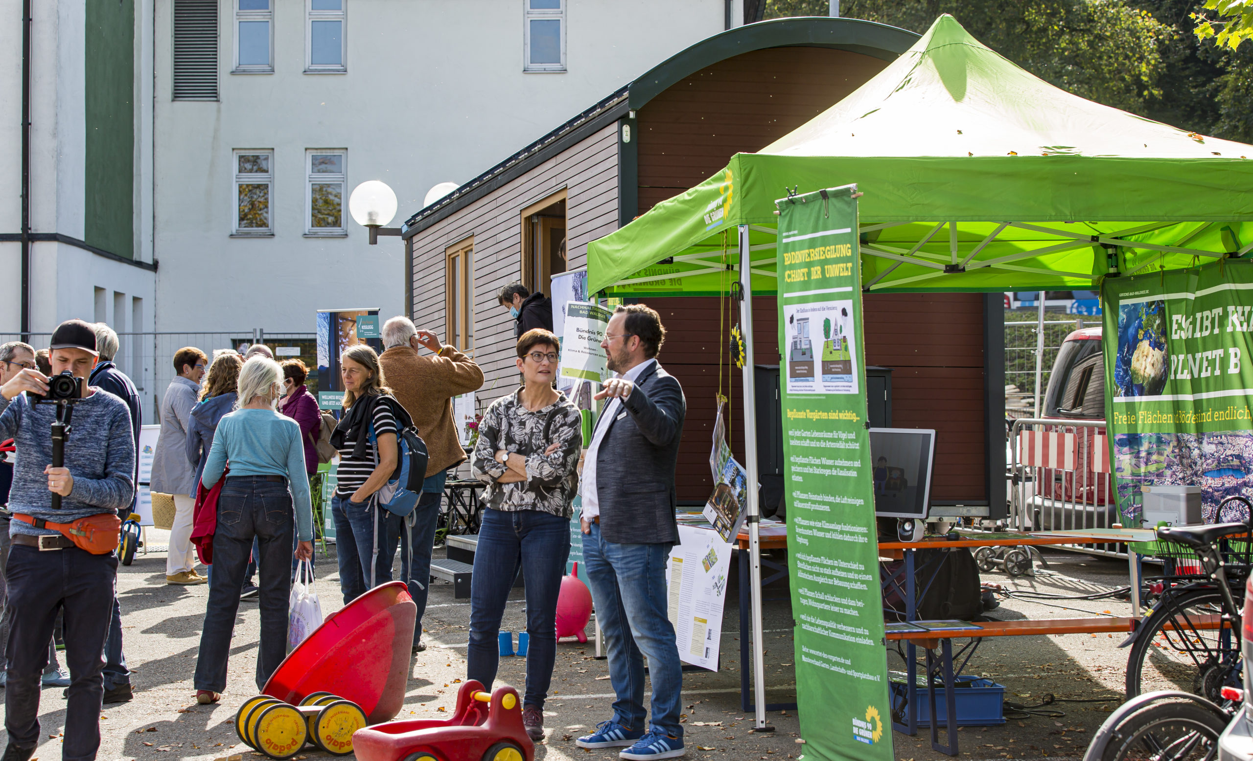 Freie Flächen und Böden sind endlich, sie wachsen nicht nach. Deshalb stand das Thema „Flächennutzung“ im Zentrum des Stands von Bündnis 90 / Die Grünen beim Nachhaltigkeitstag in Bad Waldsee. Die Grünen erläuterten, wie Wohnen und Stadtentwicklungsplanung das Klima beeinflussen. Mit einem Tiny House (www.tiny-house-kisslegg.de), das besichtigt werden konnte und regen Zuspruch fand, zeigten sie ein konkretes Beispiel für alternative Wohnformen.