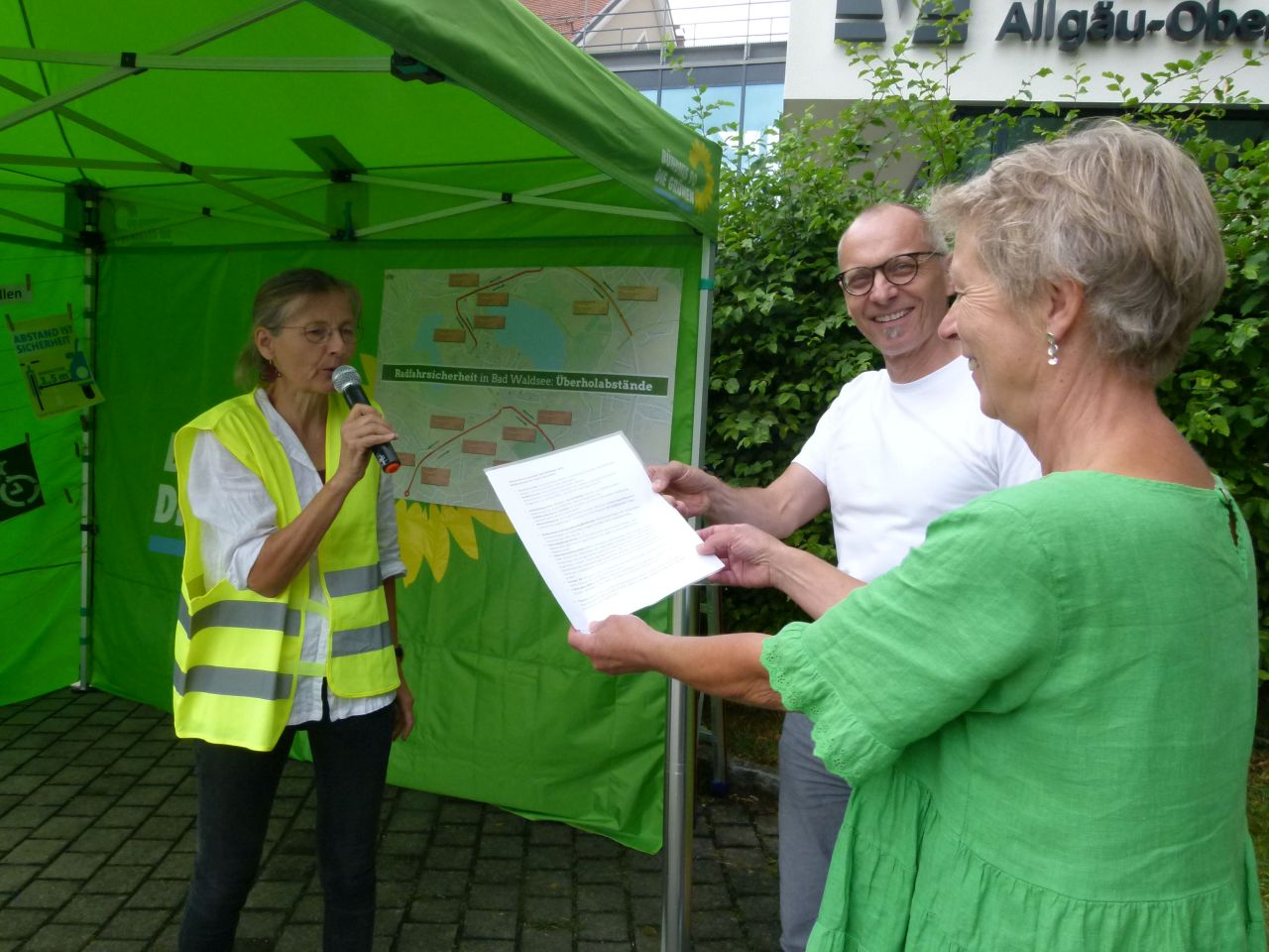 Ein Besucher lobte die Messaktion ausdrücklich „auch wegen der Sicherheit für die vielen fahrradfahrenden Schüler“, die unter anderem auch auf der alten B 30 entlang des Wertstoffhofs gefährlichen Situationen ausgesetzt seien. Noch vor Beginn der abschließenden „Poolnudelfahrt“ übergaben die Organisatorinnen OB Stellvertreterin Lucia Vogel und dem Leiter des Tiefbauamts Jürgen Bucher ein großes Straßenbanner, auf dem der 1,5 m – Abstand großflächig anschaulich dargestellt ist. Damit kann sogleich eine Abstandskampagne gestartet werden, die sich die Initiatorinnen von der Stadt wünschen.