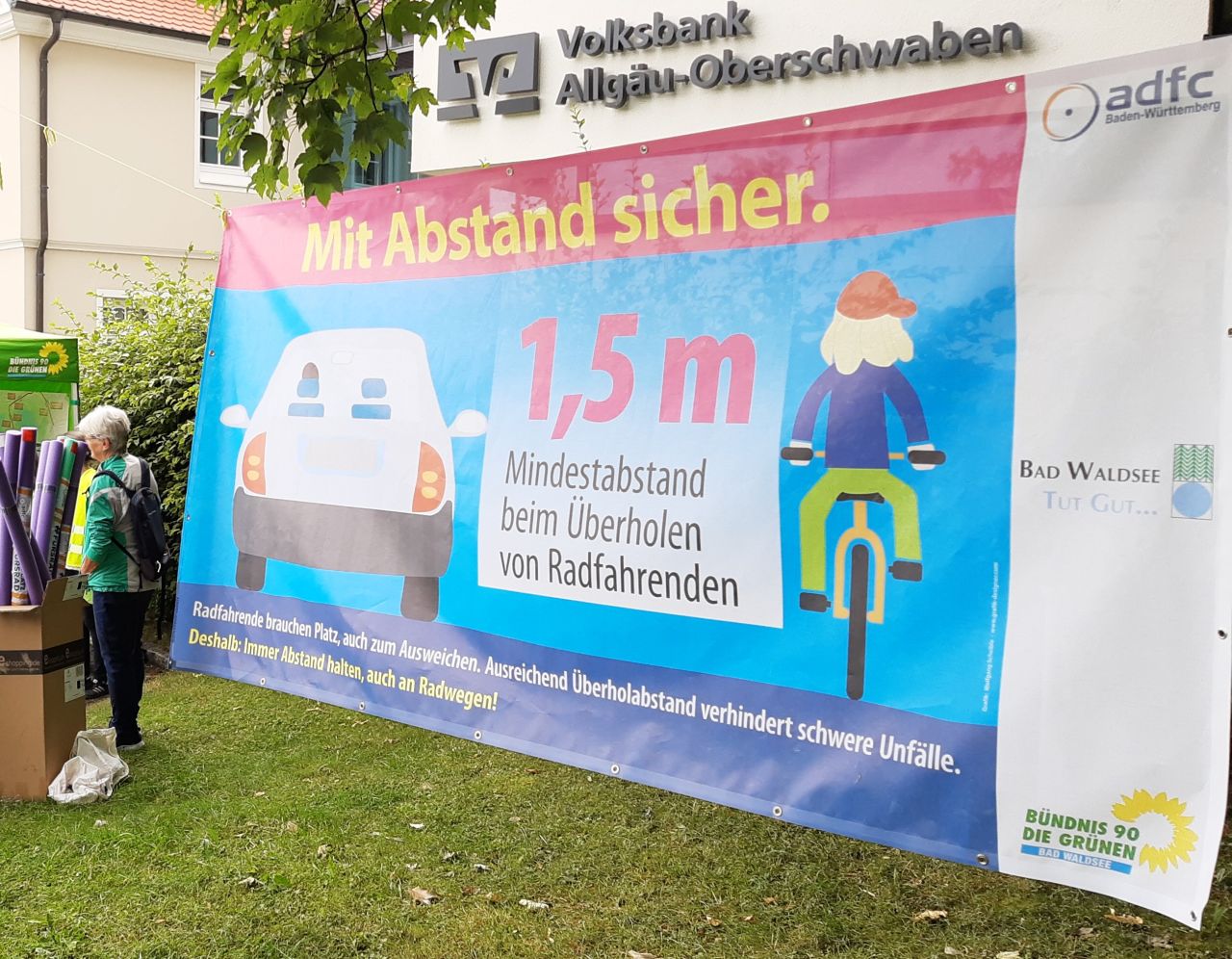 Nichts hätte den Sicherheitsabstand von 1,5 m zwischen Fahrrad und Auto deutlicher machen können als die bewegliche Schaumstoffstange, mit der Radfahrende am Samstag, 23. Juli bei der Veranstaltung der Grünen durch Waldsees Straßen fuhren. Bereits das Anbringen am Fahrradträger erstaunte die 150 cm abstehende Länge und auch während der Fahrt gab es überraschte Reaktionen, wozu auch einzelne Unmutszeichen und Schmährufe aus überholenden Autos heraus zählten.