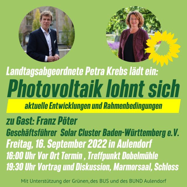 Auf Einladung der Landtagsabgeordneten Petra Krebs kommt der Experte für erneuerbare Energien, Franz Pöter, am Freitag den 16. September 2022 nach Aulendorf.